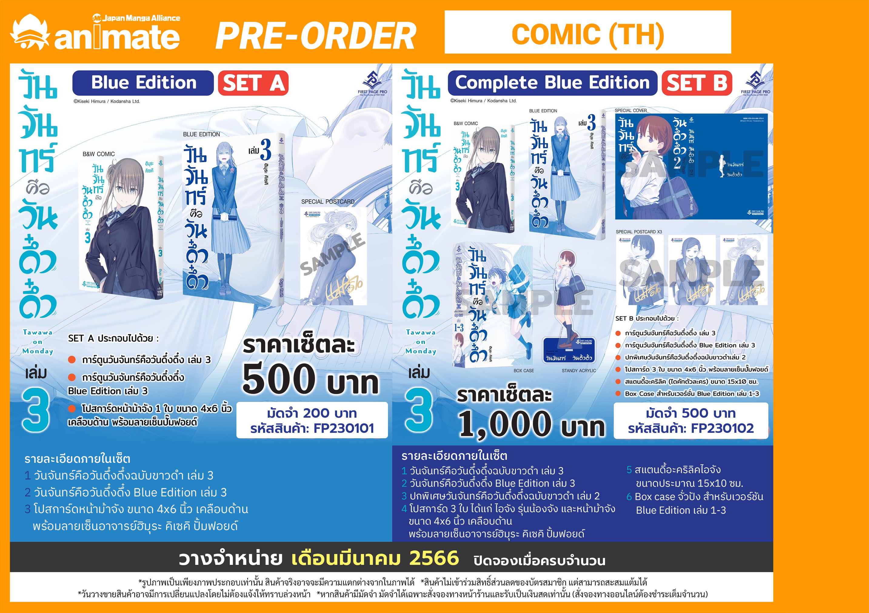 **ชำระค่าสินค้าเต็มจำนวน**Pre-order สินค้า (การ์ตูน) วันจันทร์คือวันดึ๋งดึ๋ง Complete Blue Edition เล่ม 3 Set Bรายละเอียดภายในเซ็ต1.วันจันทร์คือวันดึ๋งดึ๋งฉบับขาวดำ เล่ม 32.วันจันทร์คือวันดึ๋งดึ๋ง Blue Edition เล่ม 33.ปกพิเศษวันจันทร์คือวันดึ๋งดึ๋งฉบับขาวดำ เล่ม 24.โปสการ์ด 3 ใบ ได้แก่ ไอจัง รุ่นน้องจัง และหน้าม้าจัง ขนาด 4x6 นิ้ว เคลือบด้าน พร้อมลายเซ็นอาจารย์ฮิมุระ คิเซคิ ปั้มฟอยด์5.สแตนดี้อะคริลิคไอจัง ขนาดประมาณ 15x10 ซม.6.Box case จั่วปัง สำหรับเวอร์ชัน Blue Edition เล่ม 1-3(โดยสินค้าทั้งหมดจะถูกใส่ไว้ใน Box Case โดยปกพิเศษจะซ้อนไปกับเล่มวันจันทร์คือวันดึ๋งดึ๋งฉบับขาวดำ)ปิดรับสั่งจองสินค้า : เมื่อครบจำนวนระยะเวลาวางจำหน่าย : เดือนมีนาคม 2566*สินค้าPre-orderไม่สามารถร่วมorderเดียวกับสินค้าพร้อมส่ง***สินค้าPre-orderต่างชนิดกันไม่สามารถทำorderร่วมกันได้**